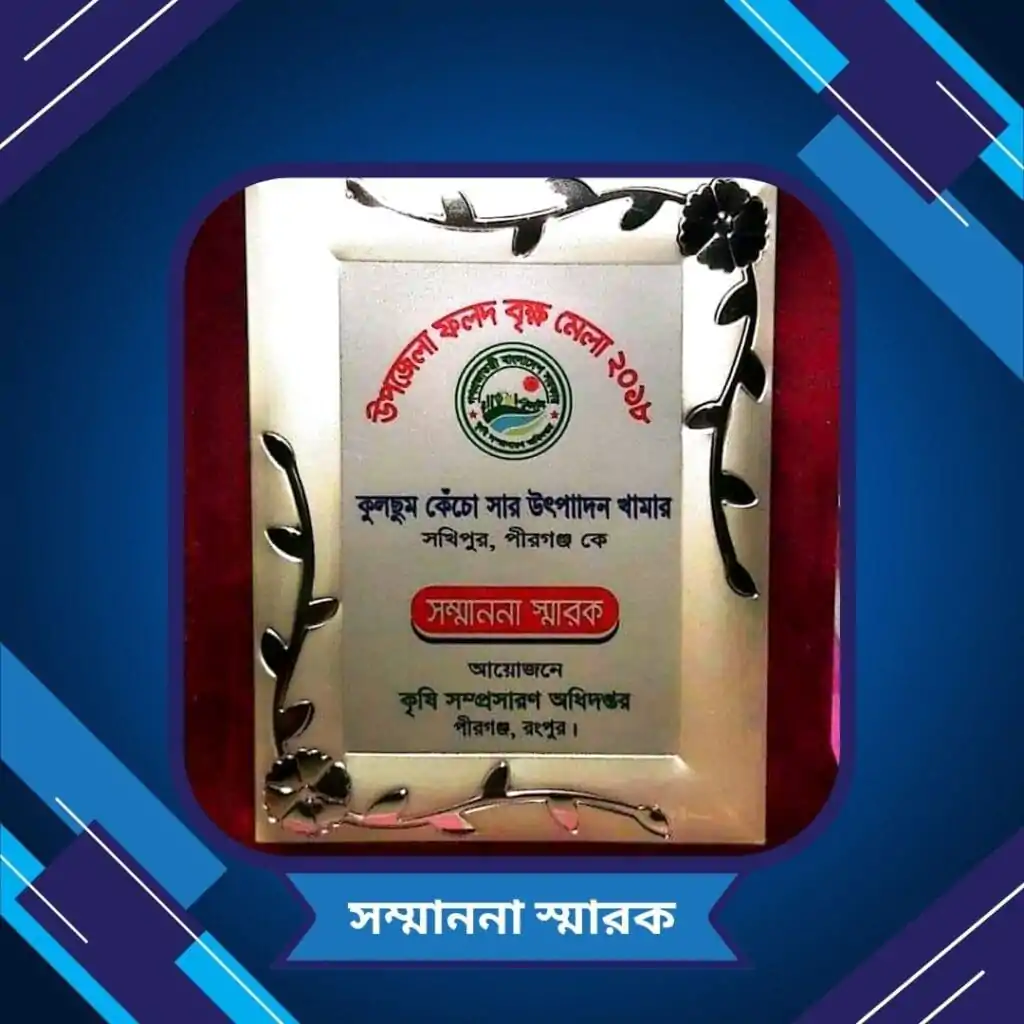 কেঁচো সার উৎপাদন করে অর্গানিক ফসল উৎপাদনে সহায়তা করার জন্য ২০১৮ সালে পেয়েছি কৃষি সম্প্রসারণ অধিদপ্তর থেকে সম্মাননা।